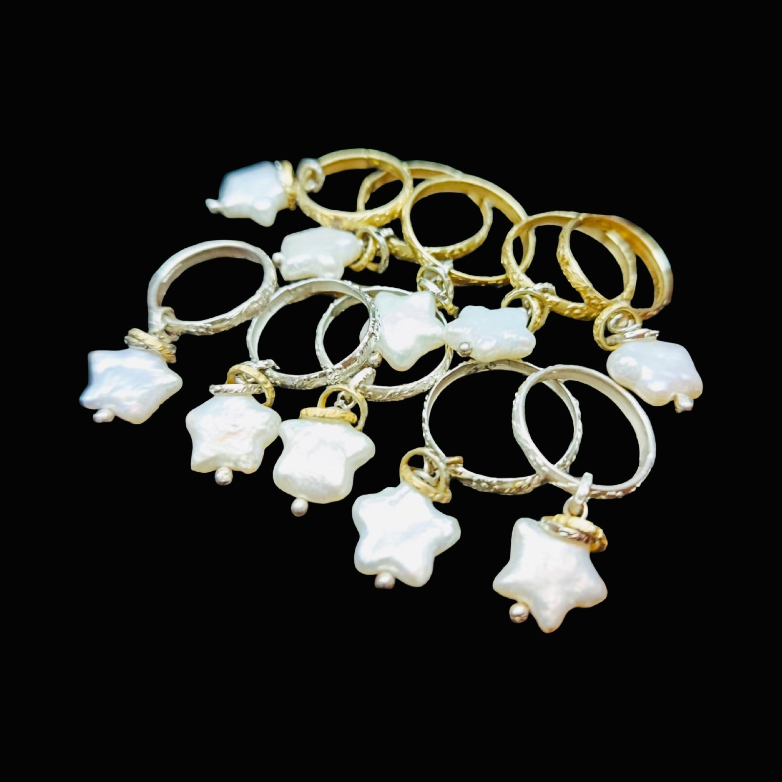 Una fedina con la perla a forma di stella disponibile in argento e oro e nelle misure da adulto e da bambina