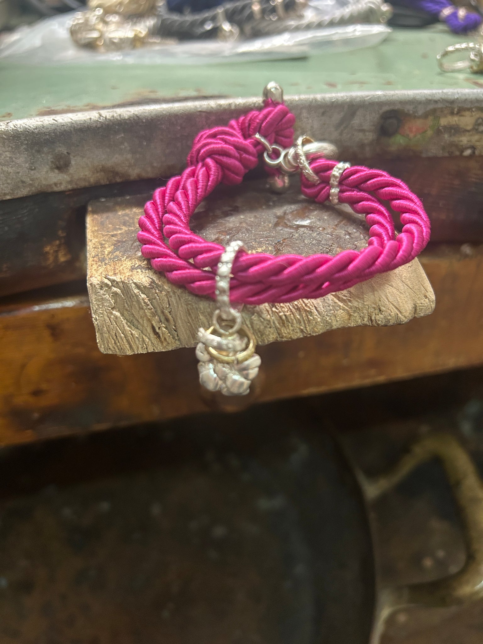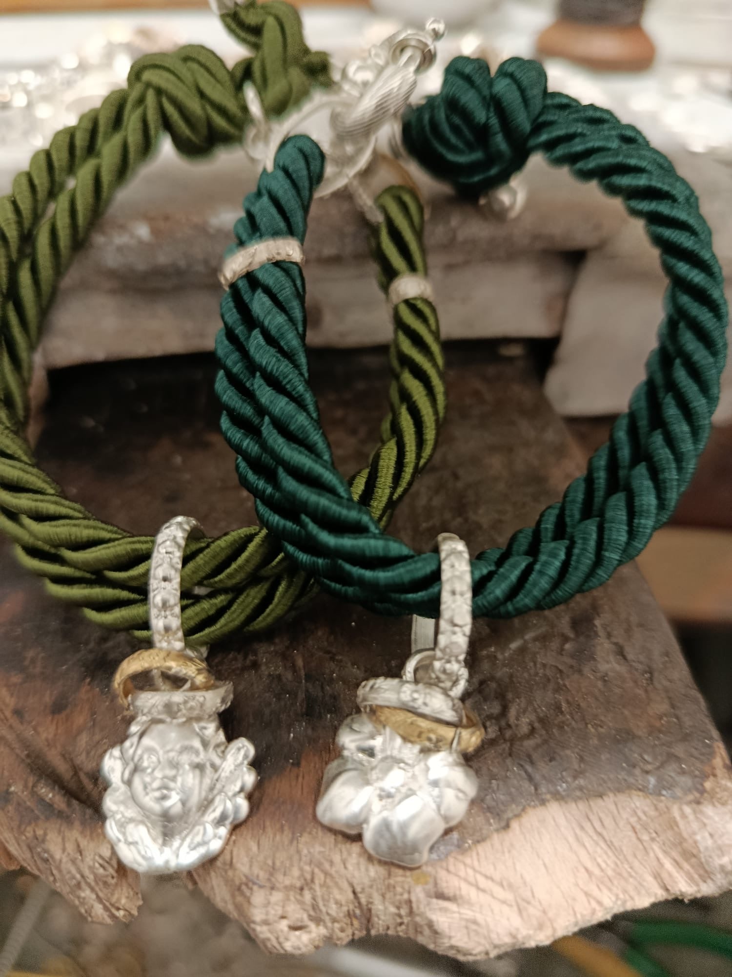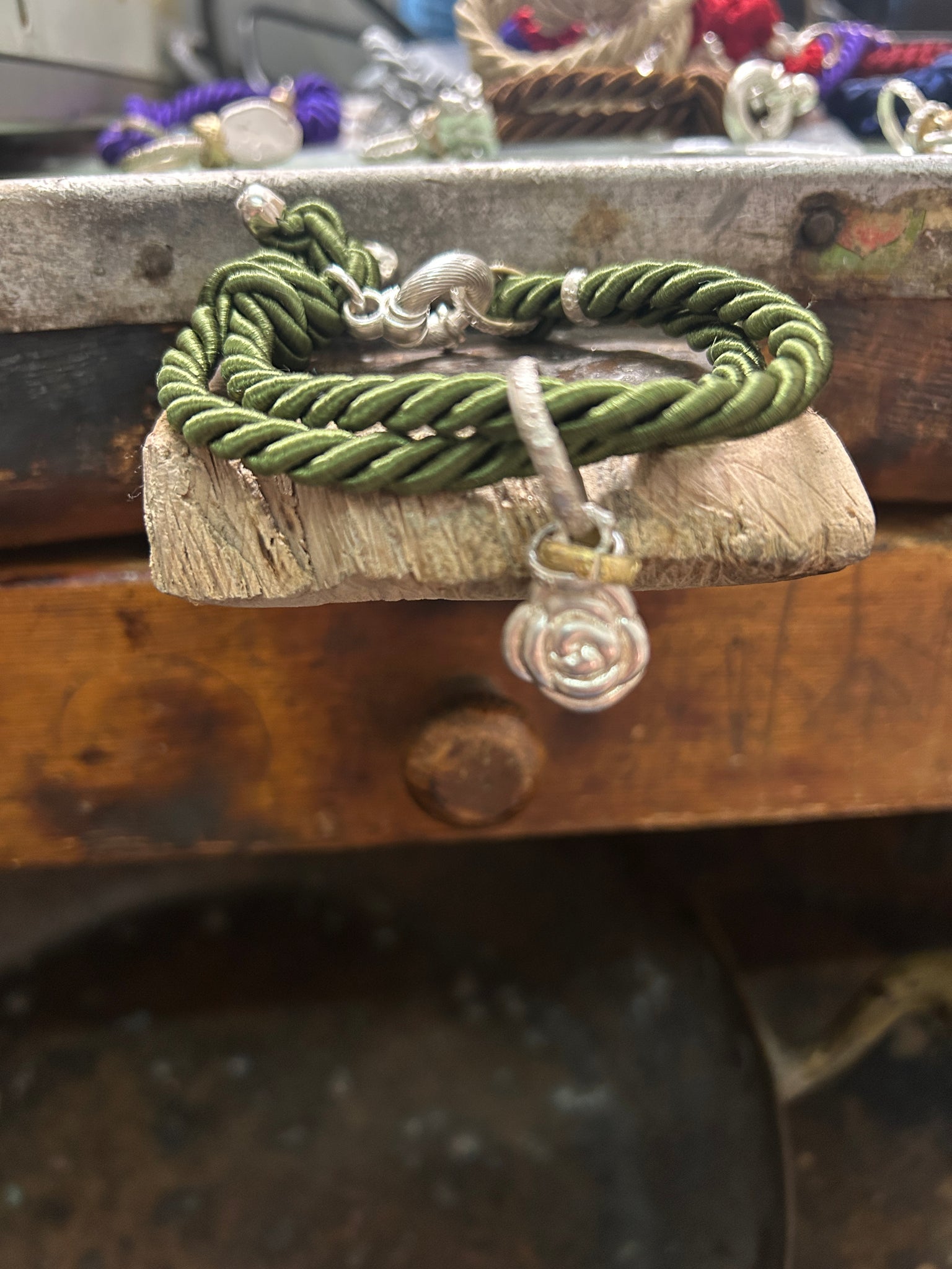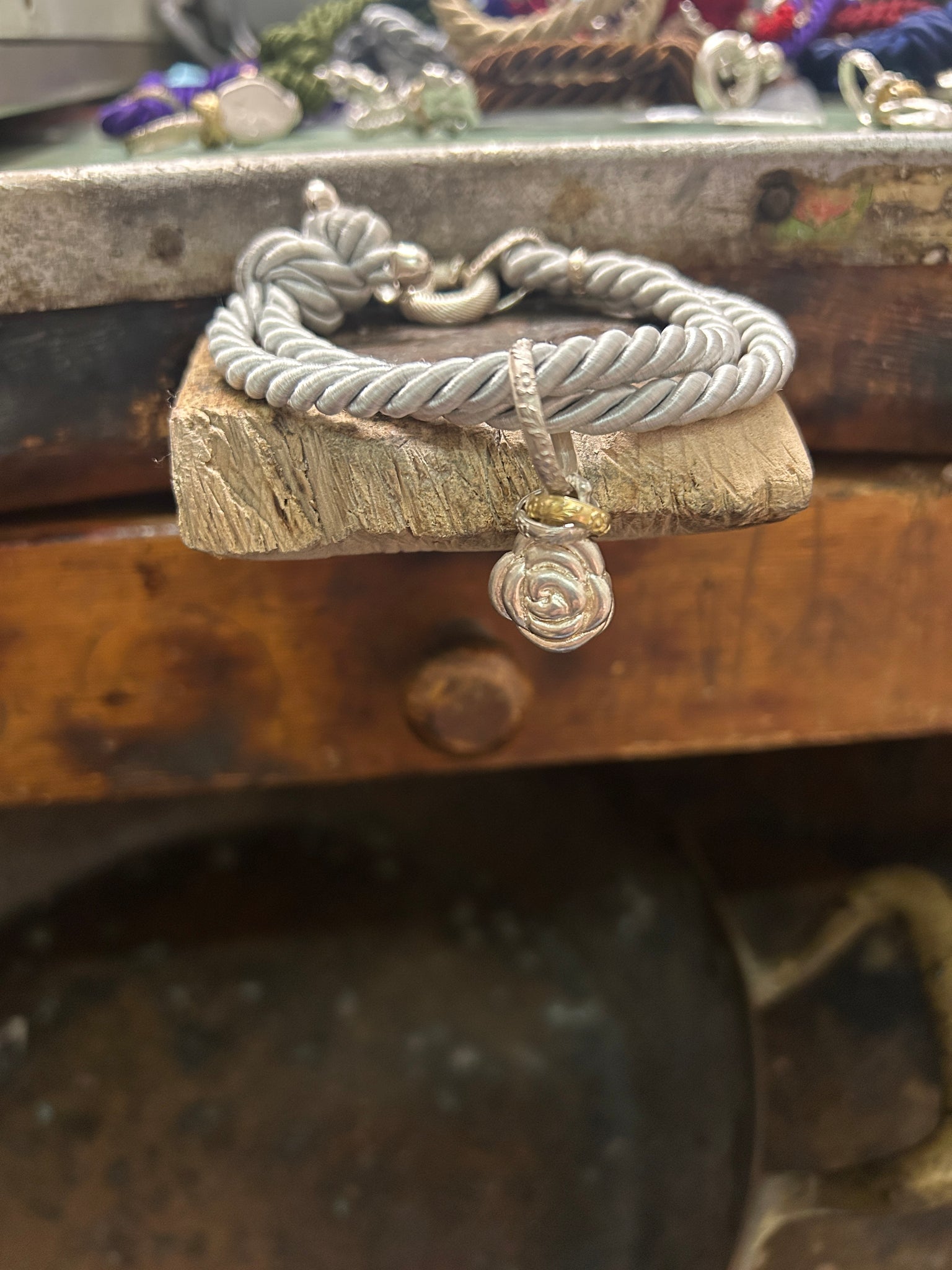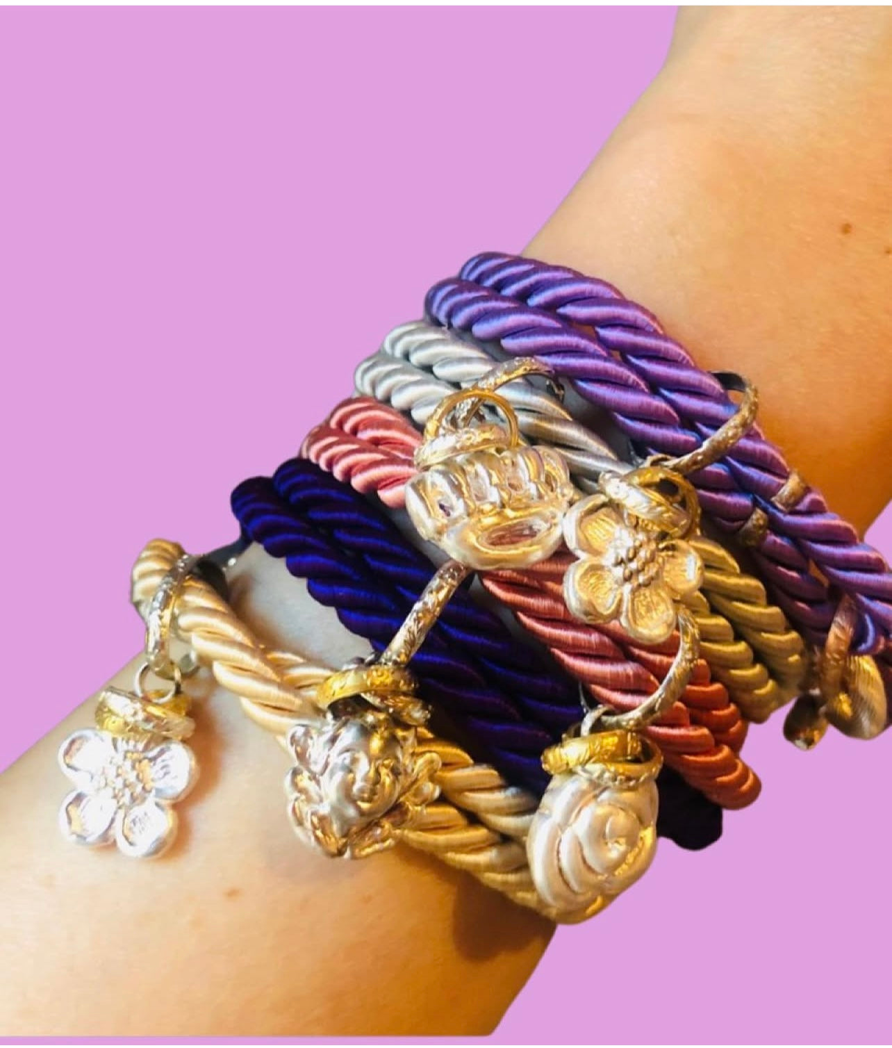 I nostri famosi bracciali di seta fatti a mano con la chiusura brevettata in argento 925 con il ciondolo o con i ciondoli della collezione Lottie.