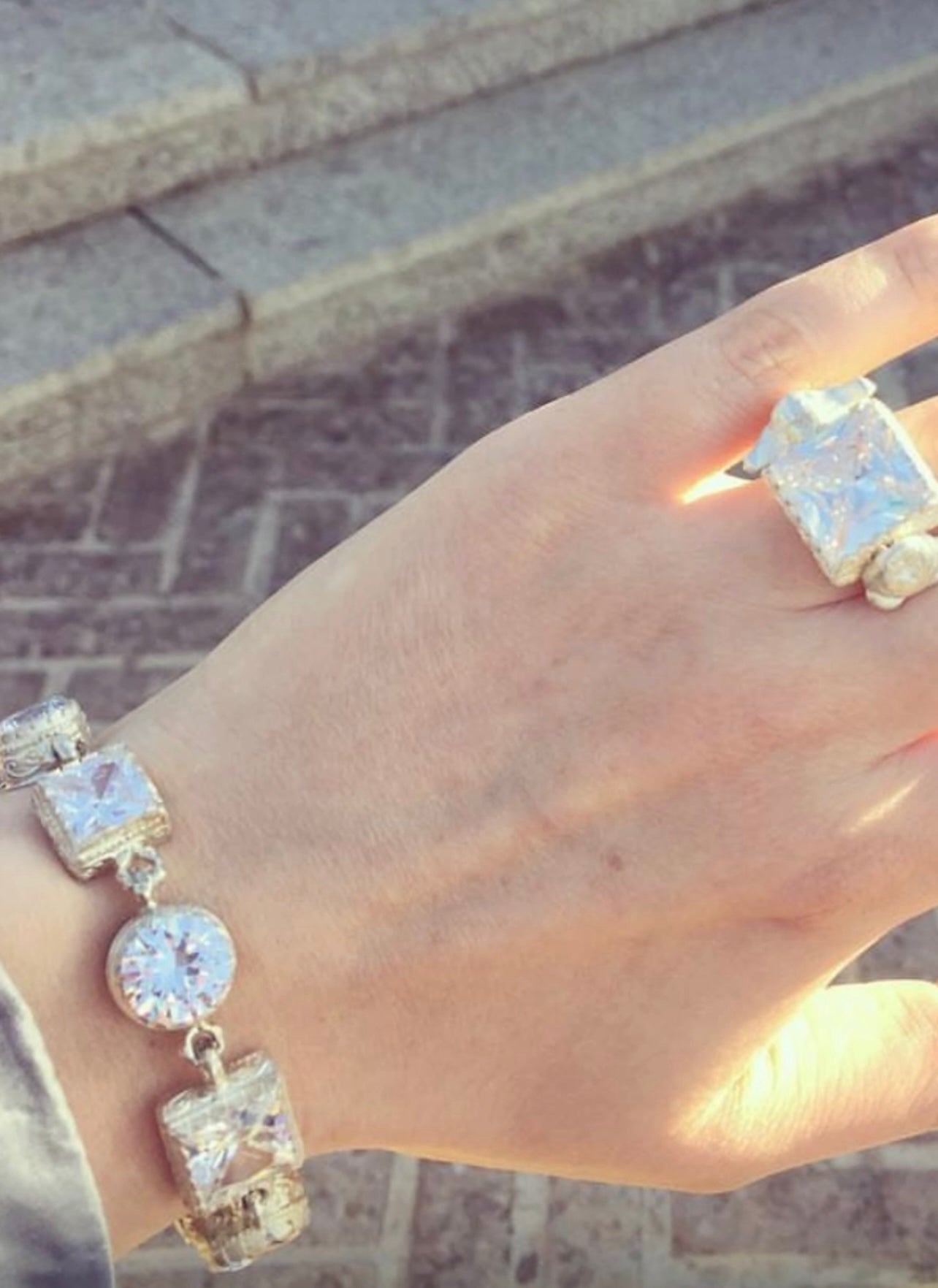 Un bracciale interamente costruito a mano in argento e zirconi. I nostri iconici castoni si alternano in una danza di forme rotonde e quadrate per abbracciare il polso della donna che lo indosserà.